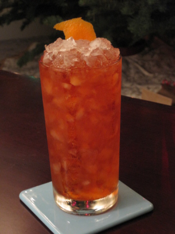 Fill a Collins glass with crushed ice. Add the ingredients, and using a bar spoon between your palms, spin the spoon in the mixture to combine and chill. Add more crushed ice — really, pack the fucking glass until the ice is mounded and the liquid threatens to overflow — and garnish with an orange wheel or, if you’re like me and didn’t leave enough room, a long, broad strip of orange zest carefully inserted down the side of the glass. Straw, please — and let it sit for a minute, to get a good frost on the outside of the glass.